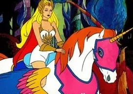 Com isso, transforma-se em She-Ra, uma guerreira poderosa, montada em Ventania, um unicórnio alado multicolorido com voz de galã.